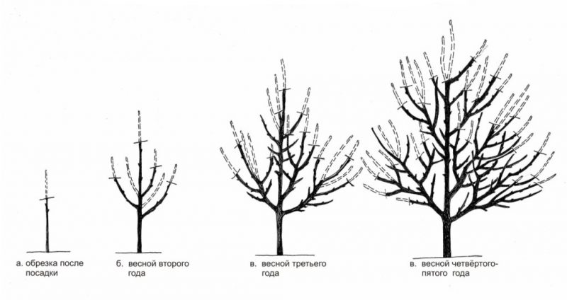 Формирующая – здесь идет моделирование внешних очертаний. Снимается нагрузка на основные ветки, составляющие «скелет» растения. Это в дальнейшем поможет дереву расти равномерно. Работать с кроной начинают спустя пять лет после посадки саженца. Проводят такую обрезку этапами, год за годом. Крона формируется в несколько ярусов, расстояние между которыми должно быть не менее полуметра. Нижний ярус составляют самые толстые ветви, располагающиеся под углом в сорок пять градусов. Полностью убирают побеги, что растут перпендикулярно по отношению к основным, скелетным ветвям. Те отростки, что мешают другим расти и развиваться, убирают на одну треть.