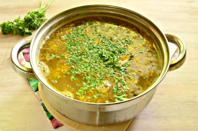 - Суп солится, приправляется, притрушивается рубленой зеленью и варится до готовности на протяжении 10 минут.