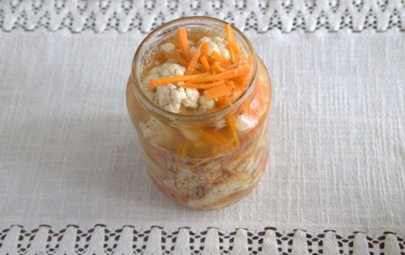Для приготовления используется плотный вилок весом до 2 килограммов. Первым шагом создания становится аккуратное разделение вилка на отдельные соцветия диаметром до 5 сантиметров. На их поверхности не должно быть почернений и следов повреждений насекомыми. Если их не очень много, пораженные участки можно срезать. Вес очищенных соцветий в этой случае составит порядка 1 килограмма. Этого объема достаточно для заполнения готовой смесью двух банок по одному литру.